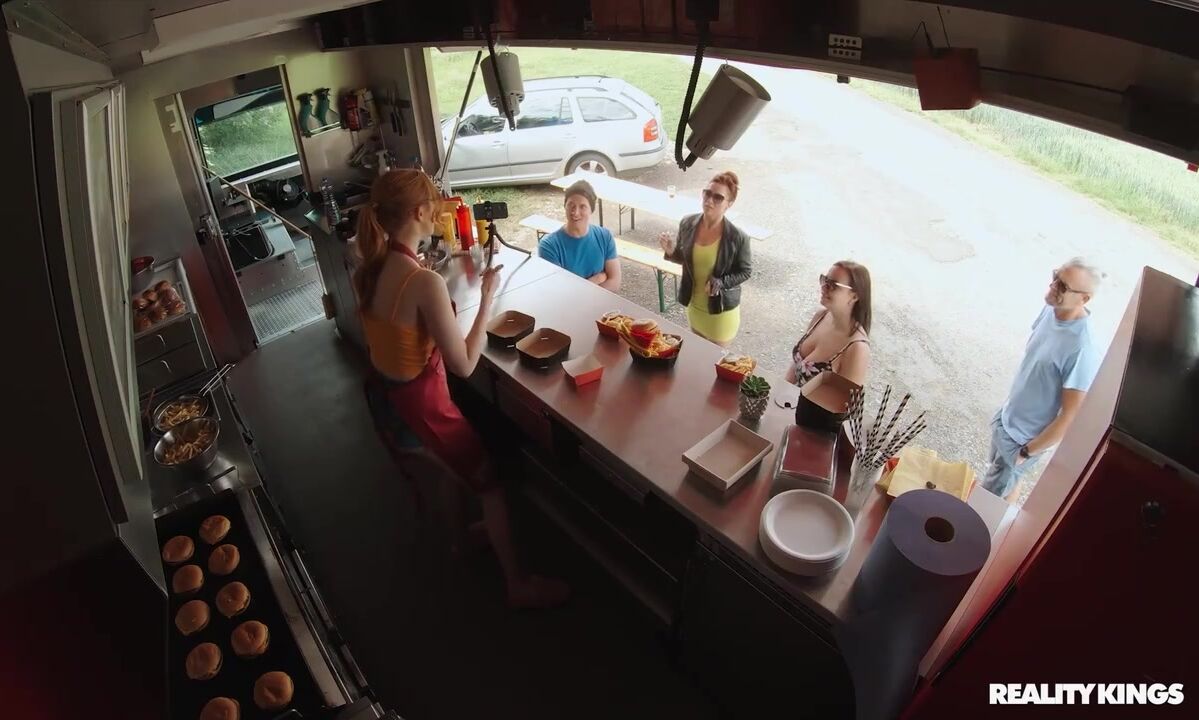 Redhead foodie Scarlett Jones finally achieved her lifelong dream of owning her own food truck. She's got the perfect location and her famous recipes, but she also has a nip slip as one of her big tits falls out of her tank top as she waits for customers! Soon Scarlett is swamped with orders, and luckily her buddy Charlie Dean stops by to help out. After the rush is over, Scarlett thanks Charlie with a blowjob, and he devours her delicious pussy on the counter before slipping her his sausage. Scarlett gets fucked on the counter, then tastes Charlie's special sauce.